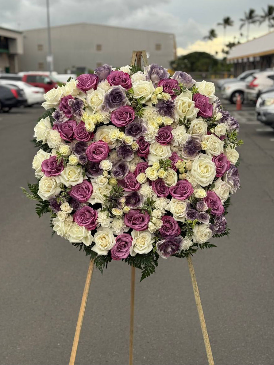 This wreath of purple, pink, and white roses designed to make a grand and heartfelt statement. This elegant arrangement expresses love, support, and remembrance with its rich, welcoming colors.